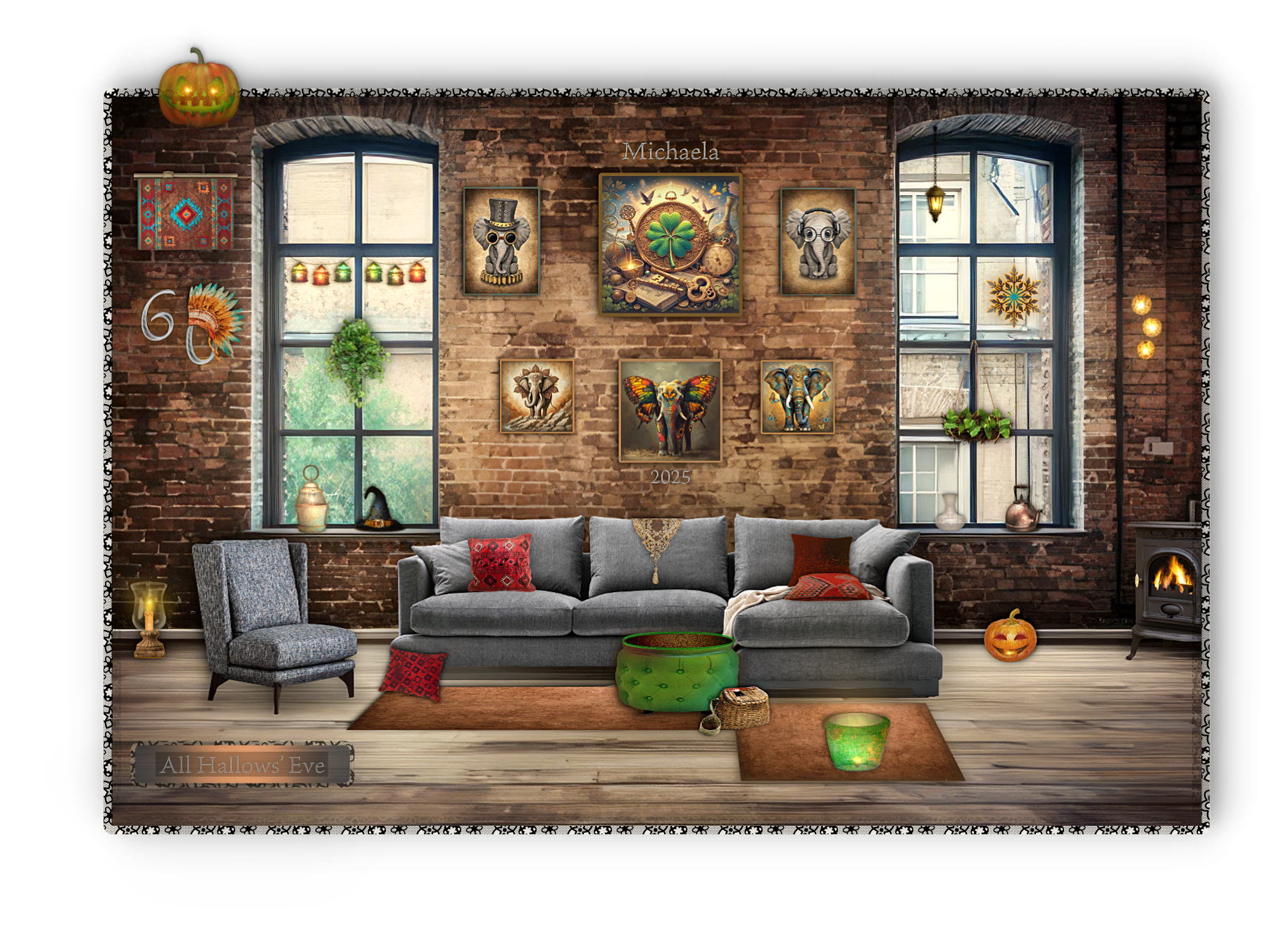 Meinem kleinen Blick hinter die Kulissen zufolge sind die Arbeiten, welche ich im Rahmen meiner kreativen Leidenschaften ausübe, für mich mehr als nur mit leichter Hand getätigte Fingerübungen. Denn es befriedigt mich jeweils zutiefst, wenn sich meine Bemühungen als wirksam erweisen und sich allmählich eins zum anderen fügt. Eine meiner derzeitigen Lieblingsfunktionen heißt "Überlagerungen und Masken", weil man den Objekten damit so einen wunderbaren Grunge verleihen kann und ich mache wirklich reichlich davon Gebrauch :-). Die Kunst ist natürlich wie immer im Leben, die richtige Dosis zu treffen, aber ich fühle mich diesbezüglich sicher und das merkt man auch. Eine weitere, von mir gerne praktizierte Fertigkeit ist die unaufdringlich präsentierte Selbstachtung, denn ich bin der Meinung, dass echte Werte nur selten mit Getöse daherkommen. Dass diese Haltung oft fälschlicherweise als Bescheidenheit interpretiert wird, kann mir dabei nur recht sein; denn wo Gold ist, da kommen die Räuber. Ich bin ebenfalls kein großer Freund von sogenannten "Ehrentagen", weil das für mich immer so was Endgültiges hat. Allerdings kann auch ich dem Zahn der Zeit nicht entfliehen, das Schicksal hat seinerzeit allerdings eine außerordentliche Freude für mich zustande gebracht, indem es meinen Geburtstag auf ein besonders wirksames Datum legte. Meinem Mythos, eine waschechte Hexe zu sein, hat es jedenfalls sehr geholfen, denn nur so werden Legenden gebildet. Freuen Sie sich daher nun auf einen Tanz in allen Räumen und falls bei Ihnen grade die Heizung ausgefallen sein sollte, dann dürfen Sie sich gerne an meinem gemütlichen Kamin platzieren. Ich habe sogar extra für Sie virtuelle Brennhölzer aus aller Herren Länder einfliegen lassen, so wertvoll sind Sie mir. In meinem digitalen Ofen flackert daher nun lustig das Kirschkernholz in Mahagonioptik vor sich hin und das duftet nicht nur exzellent, sondern es wärmt auch bildschön und außerordentlich gut.